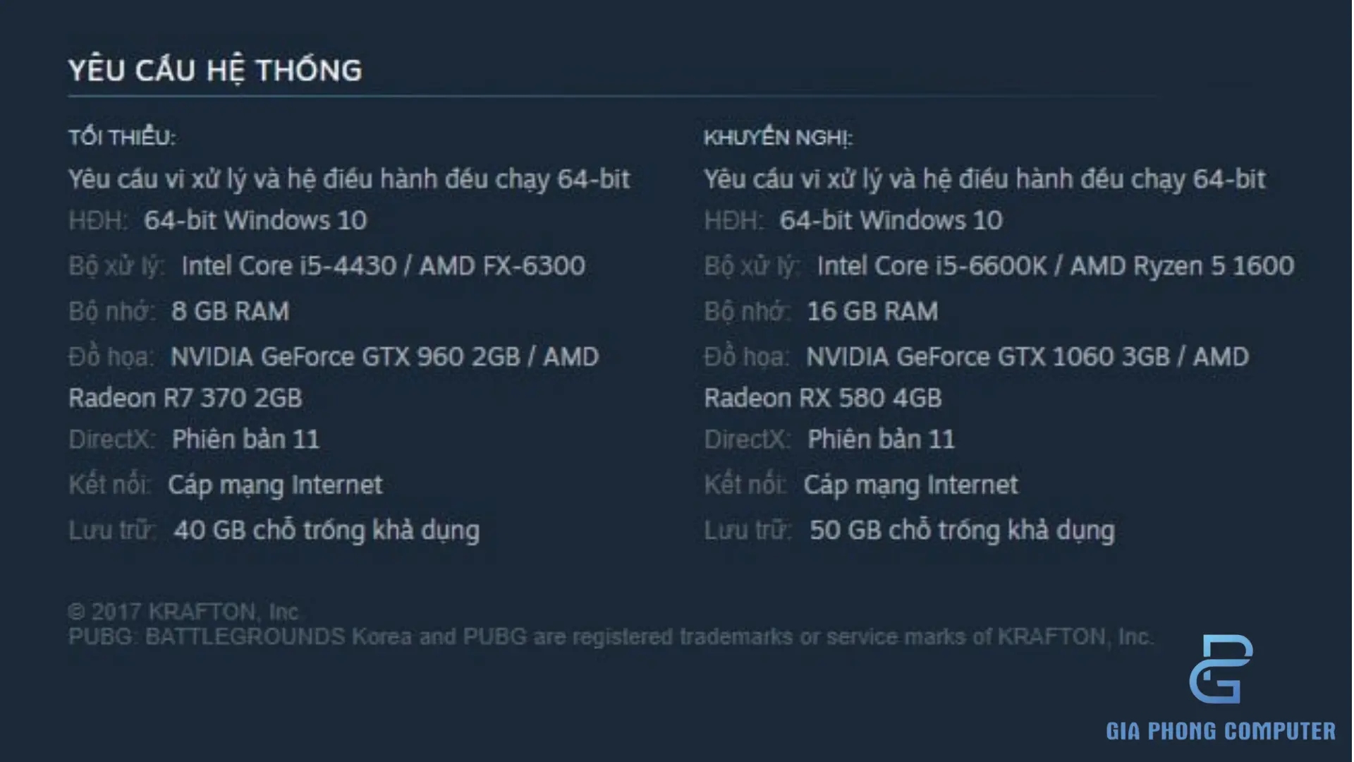 Cấu hình đề xuất cho từng phân khúc người chơi PUBG