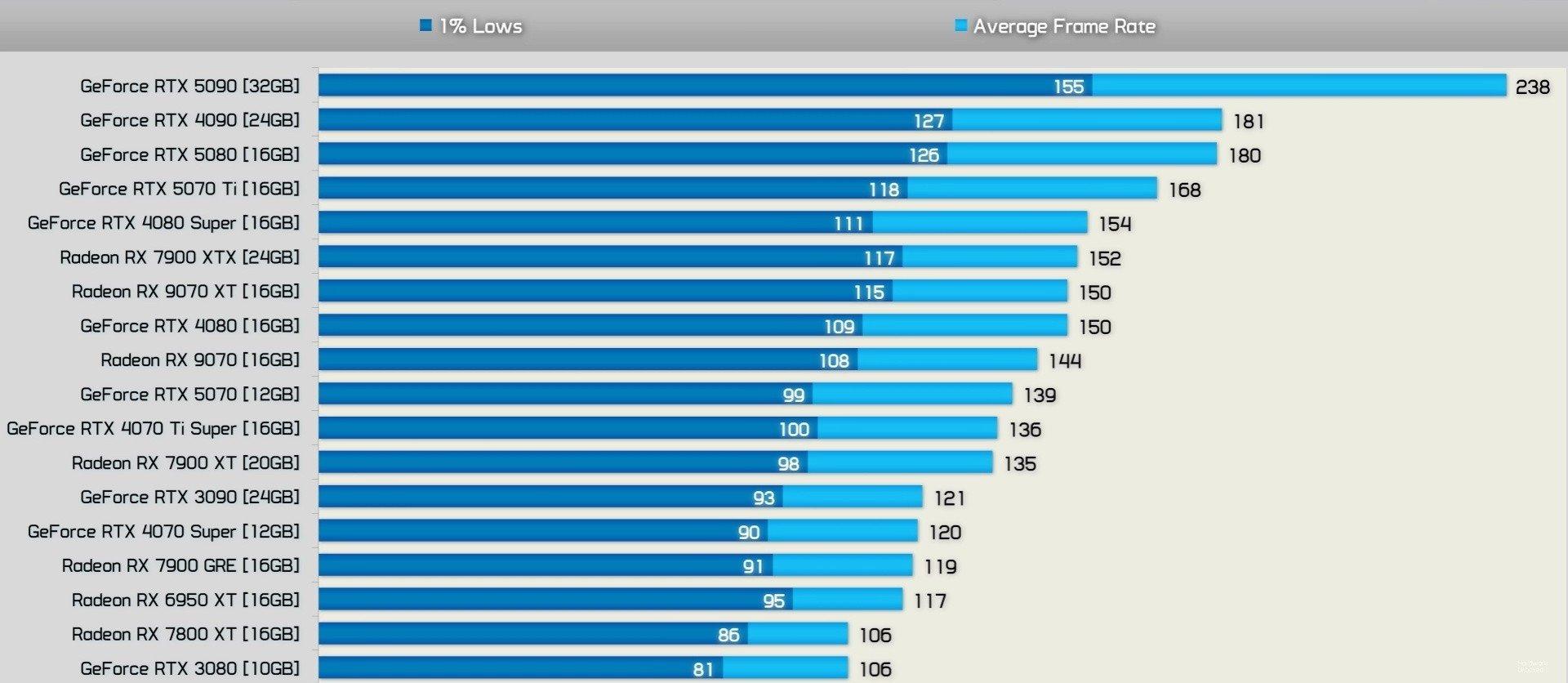 Các GPU được thử nghiệm bao gồm từ tầm trung đến cao cấp: RTX 5090, RTX 4090, RTX 4070 Ti, RTX 4060 Ti, RX 7800 XT, RX 7700 XT, RX 7600 XT, v.v. Mỗi card được test ở ba độ phân giải: 1080p, 1440p, và 4K cùng bốn preset đồ họa: Low, Medium, High, Overkill.