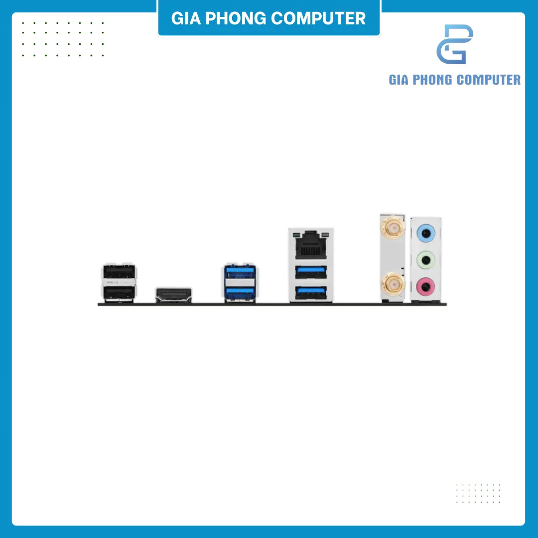 Các đường trang trí nhẹ trên PCB tạo điểm nhấn mà không gây rối mắt. Điều này khiến mainboard dễ dàng phối hợp với nhiều kiểu case và bộ tản, từ phong cách đơn giản đến các bộ máy có đèn RGB nổi bật. Khách build máy tại Gia Phong Computer thường đánh giá cao sự “gọn – đẹp – dễ phối” của mẫu main này khi đặt vào case Micro-ATX.